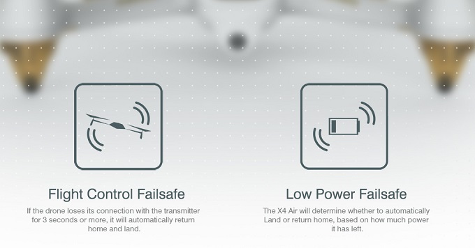 The built-in GPS enables the quadcopter to enter into failsafe mode if the connection to the radio transmitter is lost. In failsafe mode the flight control system will automatically control the quadcopter and return to the home-point and land safely; you can also manually switch the Quad to failsafe mode directly from the return to home function switch on the transmitter. The built-in GPS is also utilized for the Follow me mode which enables the quad to follow and record your activities.