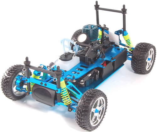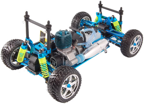 Specifications: Length: 400mm Height: 160mm Width: 250mm Wheelbase: 275mm Gear Ratio 2 Speed: 5.84:1(H) 8.58:1(L) Ground Clearance: 26mm Front Tyres: 32mm width 86mm diameter Rear Tyres: 40mm width 86mm diameter Radio: Stick type Engine: Infinity .18 Required to use: Fuel, glow start (both optional below) and 12 normal aa batteries.