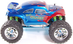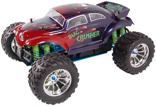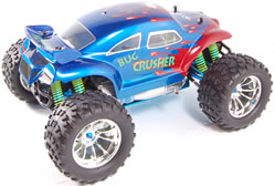 The Bug Crusher Pro is the ultimate 1:10 scale monster truck with many hop ups included as standard. If you want a race ready monster truck with all the main upgrades pre-installed then this is the perfect choice. You can't get a 1/10th monster truck with a longer features list or that looks this good. We have taken a standard Bug Crusher and then crammed it with all the best optional parts which if purchased separately would cost a lot more. Also included is a rechargeable battery pack and charger for the electronics which gives more power and speed to the servos than using normal AA batteries.  Available with Blue or Purple shell