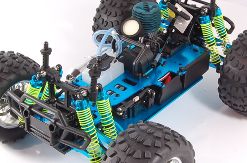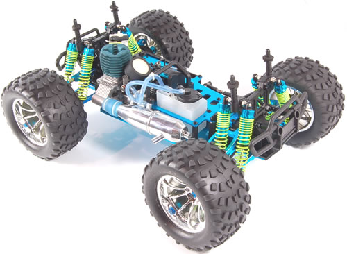 Specifications: Length: 400mm Height: 185mm Width: 310mm Wheelbase: 275mm Gear Ratio 1 Speed: 13.34:1 Ground Clearance: 30mm Tyres: 60mm width 120mm diameter Radio: Stick type Engine: Infinity .18 Required to use: Fuel, glow start (both optional below) and 12 normal aa batteries.