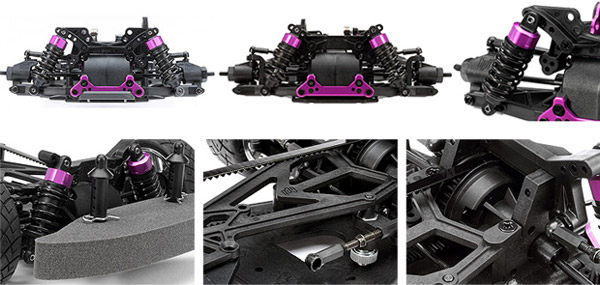 The full ball bearing, dual belt, 4 wheel drive transmission is very efficient and capable of handling high power modified electric motors down to 10 turns. Everything is pre-built to precise factory specs to get you drifting quickly, all you need to do is paint the bodyshell and apply the custom Art Factory decals for some sweet street looks!