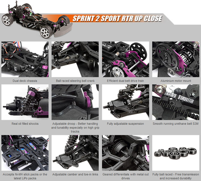 The chassis is factory assembled right out of the box, making the Sprint 2 Sport the quick and easy way to practice your mad racing skills. The RTR Sprint 2 Sport is a complete machine that looks and drives just like the real thing!