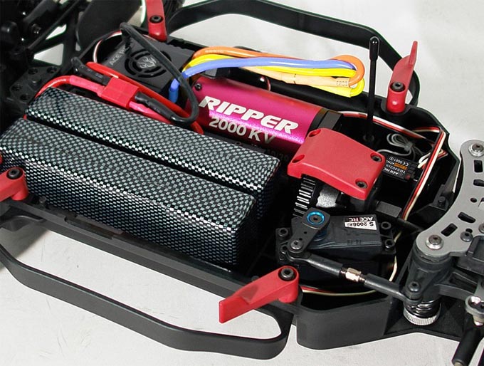 10.Molded battery tray supports two 7.4v (2Sx2 or 4S) LiPo battery packs.