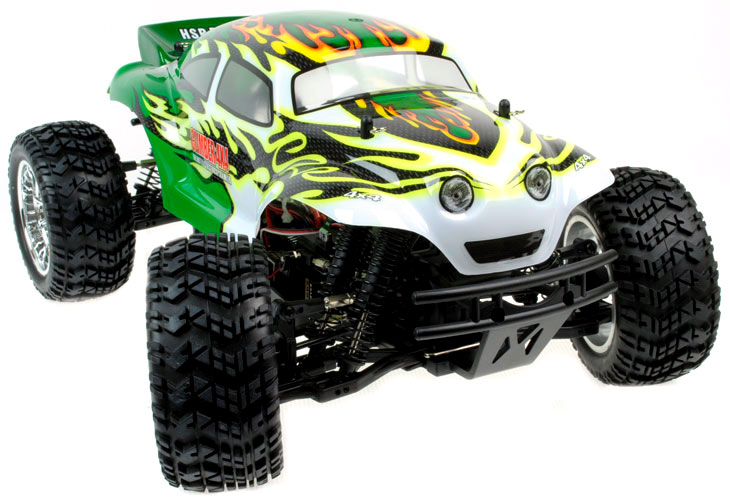 The Beetle is a cool looking RC monster truck from HSP. This monster truck has a powerful 540 motor and 7.4V 1800 mAh battery. The high grade bucket style chassis helps to reduce weight and provides protection for the electronics from dust and dirt, while the over-sized monster truck wheels and large ground clearance allow this model to go where other models can't. The 4WD system with front and rear differentials coupled with the high 1:10.3 gear ratio add to the off road ability giving the monster truck more power and torque to get over uneven surfaces. Although this is primarily an off road model, it is no slouch and still a quick racing machine.