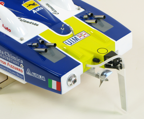 Our largest cat at 1400mm long, this class 1 R/C ready Segad is a head turner with a bright yellow and blue factory painted and finished fibreglass hull. CNC machined rudder and strut are factory installed and servos are installed inside a sealed water proof box inside the fibreglass hull. The installed 26cc engine is kept cool with the built in water pick up.